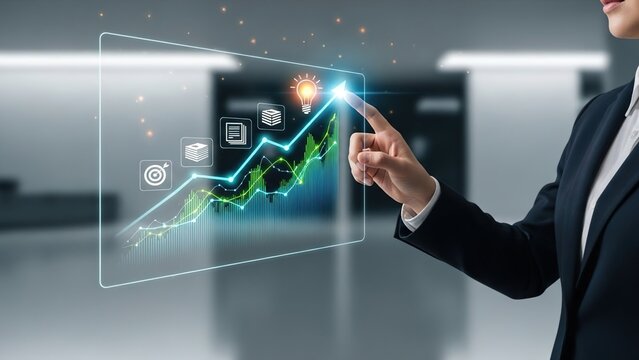 Business professional interacting with futuristic digital graph and icons displaying upward trend and business insights in a modern office environment with sleek technology.