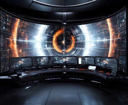 Cyber Command Center: A futuristic command center showcasing a symphony of data visualization across multiple screens, representing the cutting-edge technology.