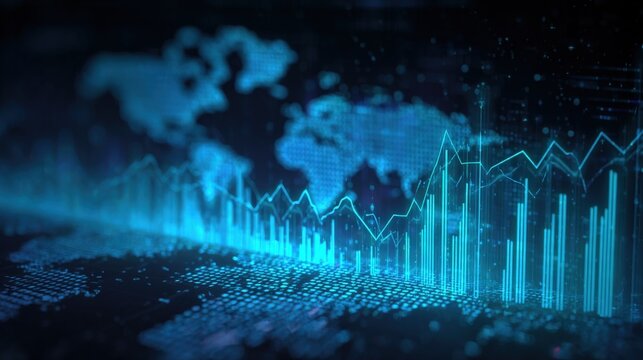 Advanced digital global financial data technology visual with interconnected blue glowing maps and chart graphs representing data analysis