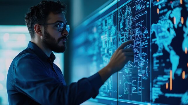 A focused man interacts with a digital interface, analyzing data on a futuristic display projecting complex information and global maps.