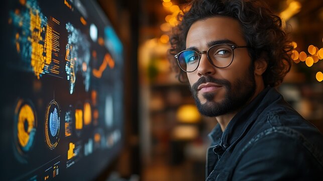 Focused man reviewing data on a large screen.