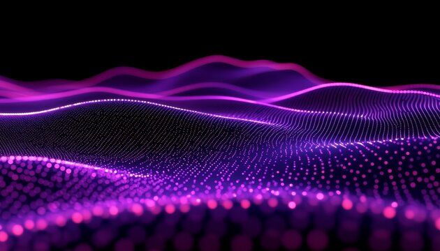 Colorful flowing wave of particles in purple background, representing digital technology, data visualization, and abstract motion illustration.