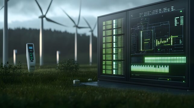 Innovative and Futuristic Green Technology with Machines in a Modern Eco-Friendly Landscape