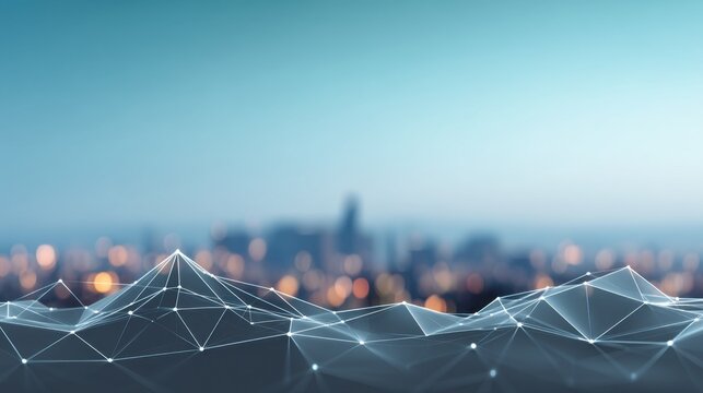 Abstract connection network with glowing points and lines over blurred city skyline background, representing technology and digital communication concepts