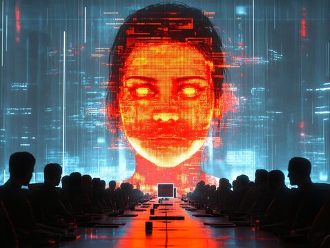A digital face projection looms over a conference table, with silhouettes of people observing, highlighting themes of technology and human interaction.