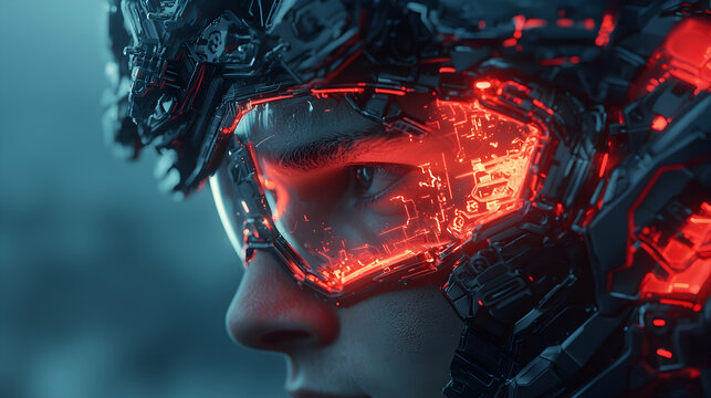 Cybernetic eye-wear glows with red light over human skin. Could be a futuristic interface or digital enhancement for data visualization applications.