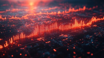 Abstract visualization of data in vibrant red tones over a digital cityscape at sunset