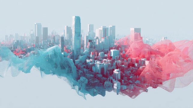 Futuristic cityscape with abstract data waves in blue and red over buildings.