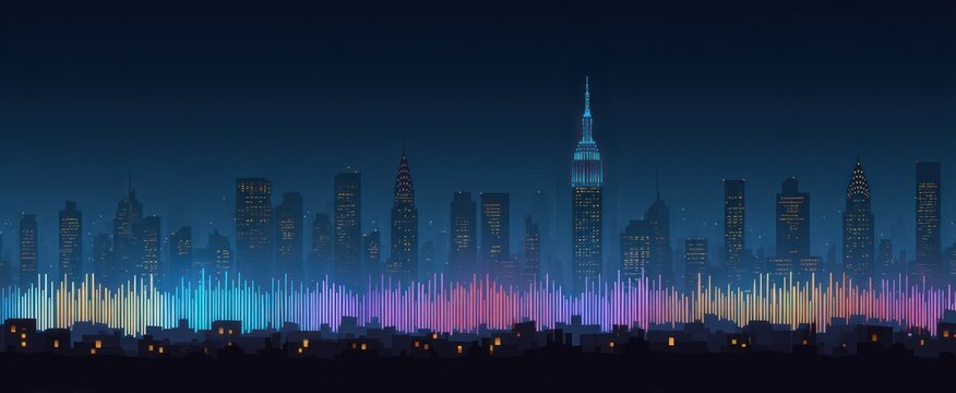 A stylized illustration of a city skyline at night, featuring buildings and colorful light beams over a silhouetted foreground