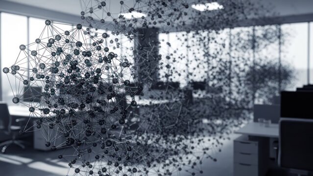 Modern office space with digital overlay representing data analysis and future planning concepts