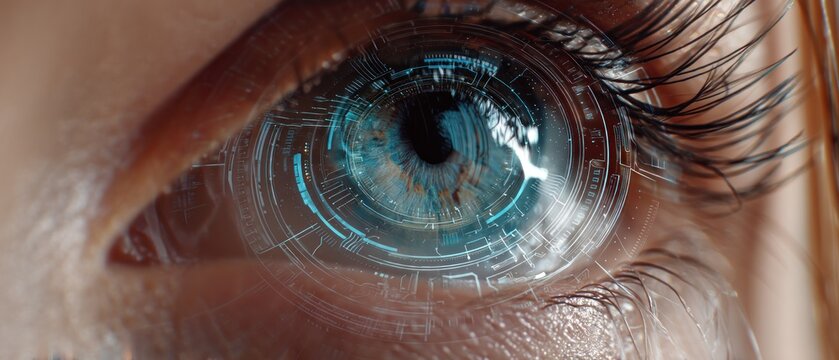 Human eye with futuristic digital interface overlay close up macro shot