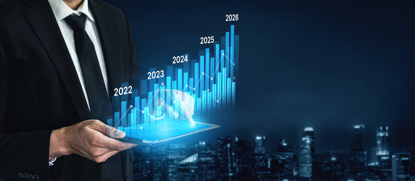 Business bar chart and line graph showing yearly business growth from 2022 to new year 2026, represent data analytics, future 2026 planning, business 2026 trend, and performance analysis 2026 Vouch