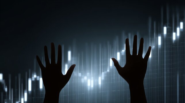 Silhouetted hands reaching towards a glowing digital chart with bar and line graph elements, symbolizing data analysis and technology interaction.