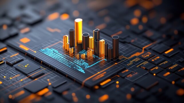 Abstract digital data visualization with glowing bar graphs on a circuit board.