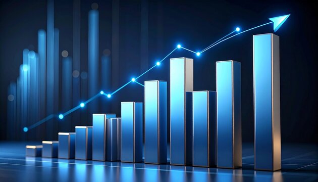 A 3D rendered image of a financial chart with bars and a red line showing an upward trend.