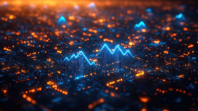 Abstract digital 3D visualization of financial data with glowing blue bar charts and a rising orange line graph representing growth and analysis