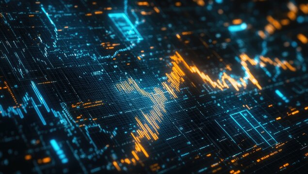 a vibrant display showcasing financial data with colorful charts and graphs, conveying the complexities of market analysis and technological advancements.