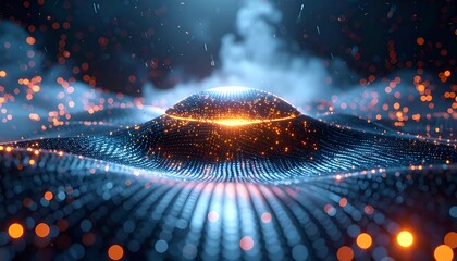 Glowing, rippling, blue and orange abstract landscape with particles