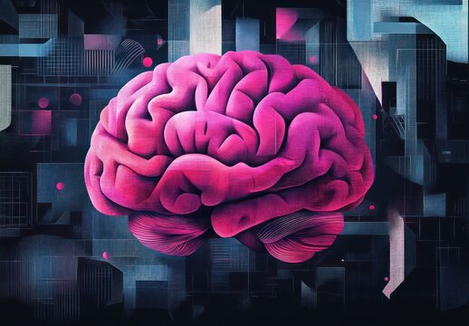 vibrant pink human brain floating above a dark futuristic digital grid with glowing dots, evoking curiosity and technological wonder