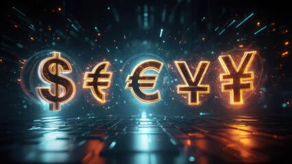 Glowing currency symbols amidst digital light and data, symbolizing international finance