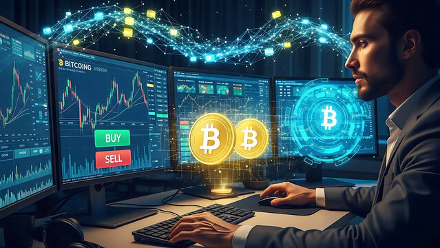 Man analyzing cryptocurrency market trends on multiple computer screens.