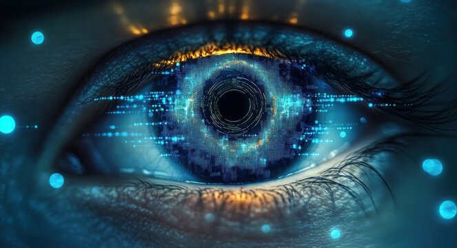 Close-up of a human eye with glowing digital elements and futuristic data visualization patterns in the iris emitting a blue and orange light