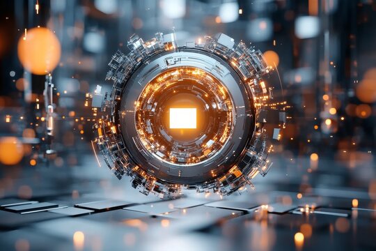 Innovative futuristic design featuring a glowing circular technology concept with abstract elements in a digital environment