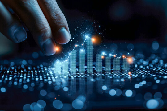 Hand touching a digital growth icon on a glowing screen, symbolizing financial progress, innovation, data insight, and modern technology. Concept of digital growth, future technology interaction.