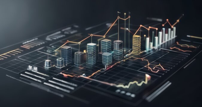 A professional 3D render of business data visualization, dynamic financial growth lines and stacked bar charts emerging from a digital touchscreen surface
