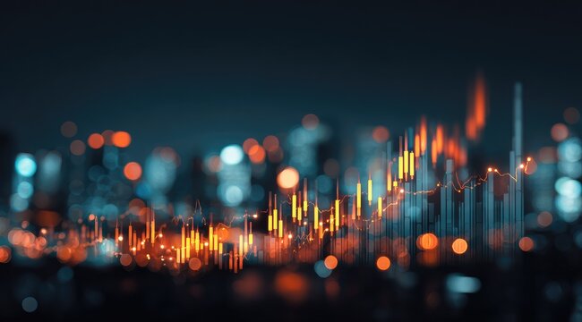 Modern city skyline with holographic financial charts and digital economy data visualization overlay