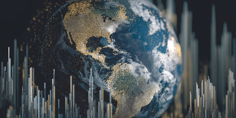 Digital representation of Earth with glowing continents surrounded by abstract vertical lines symbolizes global connectivity and data flow. image conveys futuristic and technological theme