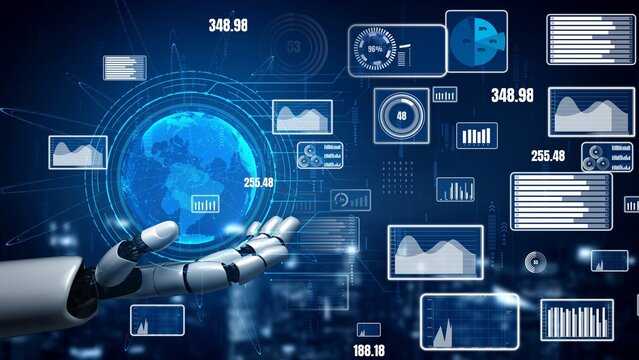 A futuristic robotic hand displays various digital data elements, including statistics and charts, against a backdrop of a globe, showcasing technological advancement and analysis. Xenic