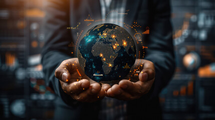 A futuristic business concept visual, showing economic growth through global business networks, with data charts and digital marketing elements surrounding a globe.