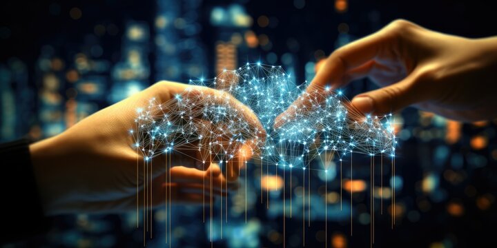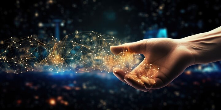 Hand holding of global data network, Big data visualization of futuristic and block chain, Financial analysis, social network of databases
