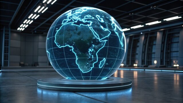 A futuristic, illuminated globe displaying a digital map of Africa in a sleek, modern environment.