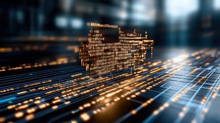 Abstract digital data stream. Blurry binary code streaks across a dark background, highlighted by orange-yellow and white light effects