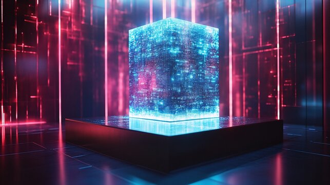 Futuristic isometric glass panels data visualization. Dark neon gradient background, modern technology abstract for AI, cloud computing, analytics, blockchain, cybersecurity, business presentation,