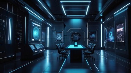 Futuristic Technology Conference Room with Glowing Blue Accent Lighting and Multiple Display Screens