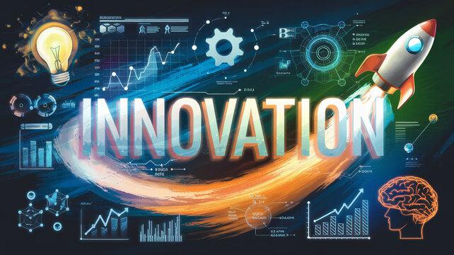 Abstract art depicting "Innovation" with lightbulb, rocket, graphs, and brain, symbolizing progress, creativity, and technological advancement