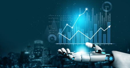 A robotic hand presents a rich digital data visualization with graphs and statistics, set against a modern city skyline at night, symbolizing technological advancement and business growth. Scalp