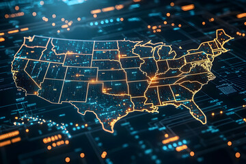 Futuristic us map with glowing borders highlighting technology and innovation