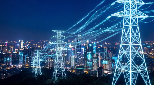 City skyline with futuristic data visualization overlay at night