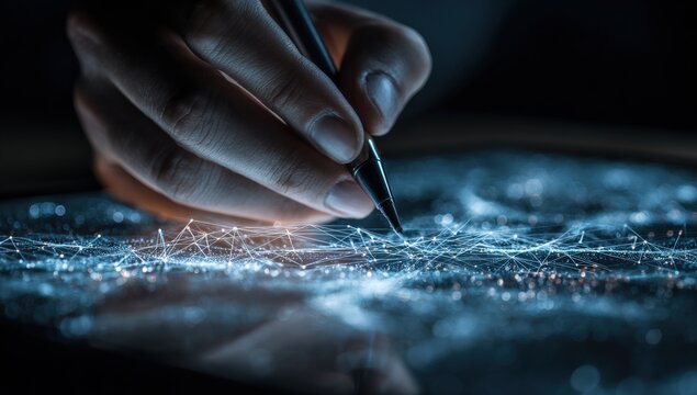 Hands typing on a laptop, overlaid with futuristic data visualizations and graphs, highlighting innovative technology and modern design.