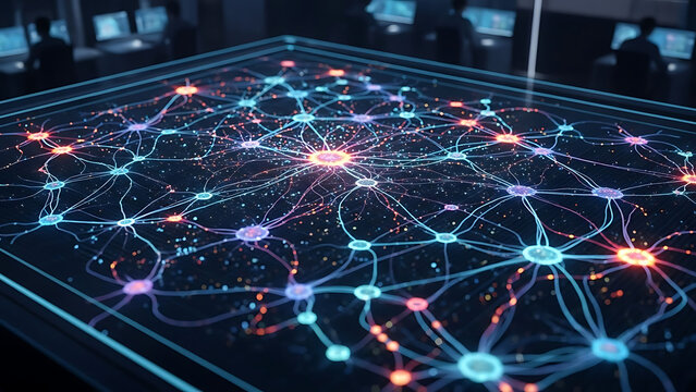 Illuminated network of interconnected nodes displayed on a dark surface in a futuristic room