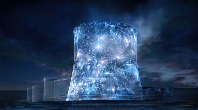 A futuristic nuclear power plant with glowing blue ice crystals on the exterior of its chimney, glowing digital data connections in the space around it, dark sky background.