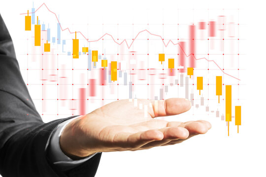 Businessman's hand holding digital stock market candles and graphs, white background. Concept of finance, investment, and virtual trading