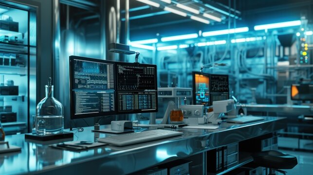 sleek and futuristic office space with a glass desk, minimalist decor, and a holographic computer interface