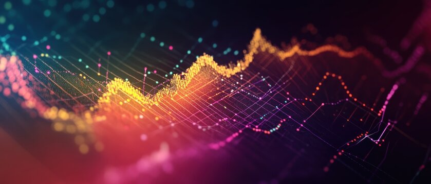 Abstract tech visualization shows data streams, ball arrays. Colorful digital design represents information analytics, data sorting. Dynamic pattern of lines, dots. Visualizes big data concepts.