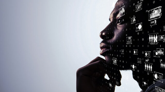 Conceptual art of a thinking individual surrounded by global data streams, highlighting connectivity and artificial intelligence themes