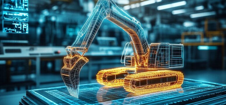 Wireframe excavator model on a digital table.